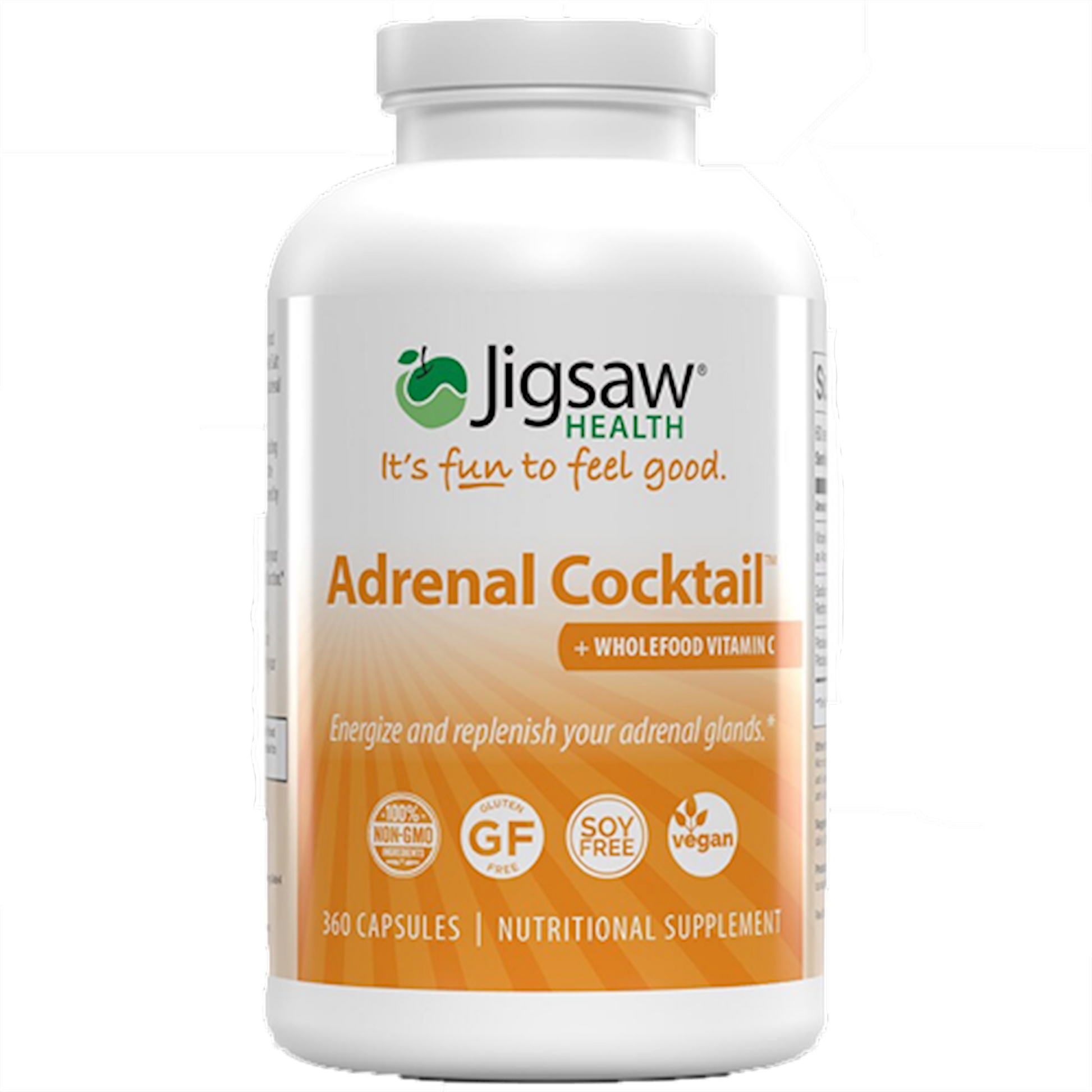 What is the Jigsaw Adrenal Cocktail The Jigsaw Adrenal Cocktail combines Whole Food Vitamin C, Potassium Bicarbonate, and Redmonds Real Salt in a unique formulation designed to support healthy adrenal gland function. Vitamin C plays a critical role in adrenal function, including their ability to produce numerous hormones. In fact, the highest concentration of Vitamin C in your body is stored by your adrenal glands. Additionally, sodium and potassium play a delicate dance in your adrenals and are both vital minerals for normal adrenal function. What can Jigsaw Adrenal Cocktail help me with: Support a balanced response to stress* Support steady energy production* Promote immune system function* What are Adrenal Glands and what do they do in your body Your adrenal glands are walnut-shaped organs that sit above your kidneys. When you're faced with a great deal of stress, your adrenal glands become overworked, exhausted and dysregulated. Why is Whole Food Vitamin C Included Vitamin C is critical for proper adrenal function. Not only is the highest concentration of Vitamin C found in your adrenal glands, but your adrenals depend on Vitamin C for the production of numerous hormones. The Whole Food Vitamin C used in the Jigsaw Adrenal Cocktail is from Acerola, derived from cherry trees in Brazil. Why are Redmond's Real Salt and Potassium Bicarbonate included Redmond's Real Salt is included because when your adrenal glands are taxed, sodium levels drop below normal and sodium starts to excrete through urine. What's worse, it takes water with it which could lead to a dehydrated state. When your adrenal glands are taxed, they produce less aldosterone -- an important hormone that when not at optimal levels disrupts sodium balance. Potassium reacts with the Whole Food Vitamin C to help lower cortisol levels. Cortisol is what is referred to as the ""stress hormone"" and rises when you're under stress. What are the signs that your Adrenal Glands are under stress* Bloating (water retention) Heavy caffeine use Stress Low energy Tired in the morning and more energy in the evening Poor immune system Cravings for salty foods