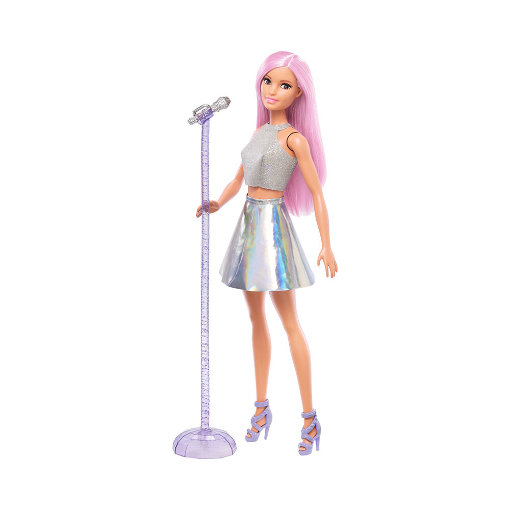 Each doll can achieve her goals wearing a career-themed outfit along with accessories to play out professional moments. There are so many careers to explore. Grab the microphone and share the spotlight with Barbie pop star doll. She wears an outfit that will sparkle on stage and comes with a microphone and stand. Plus, her long pink hair hits all the right notes! Explore and collect all the Barbie career dolls and toys because when a girl plays with Barbie, she imagines everything she can become (each sold separately, subject to availability). Includes pop star doll wearing fashions and shoes, plus microphone and microphone stand. Doll cannot stand alone. Colors and decorations may vary.