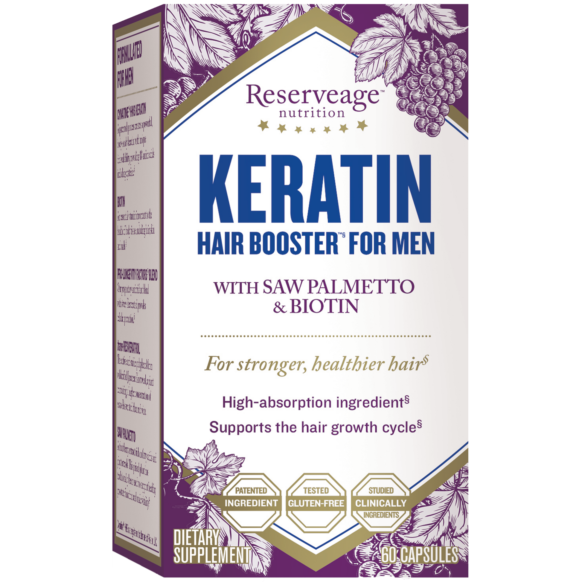 Serving Size: 2 Vegetable Capsule Servings Per Container: 30 Disclaimer Amount Per Serving Biotin 3000 mcg 1000% Cynatine HNS (Solubilized Keratin) 500 mg Pro-Longevity Factor Resveratrol 40 mg Organic French red whole grape (skin, vine, stem, seeds) (Vitis vinifera) full spectrum polyphenol profile USDA certified organic muscadine red whole grape (skin, vine, stem, seeds) (Vitis rotundifolia) and natural wild Polygonum cuspidatum standardized to contain a minimum of 20 mg of trans-Resveratrol Quercetin (as quercetin dihydrate) 20 mg Plant Phytosterol Complex 300 mg Beta Sitosterol 120 mg Campesterol 60 mg Stigmasterol 40 mg Saw Palmetto Berry Extract (Serenoa repens)(standardized to 40-45% fatty acids) 160 mg Other ingredients: Vegetarian capsule (vegetable cellulose), rice bran, silica