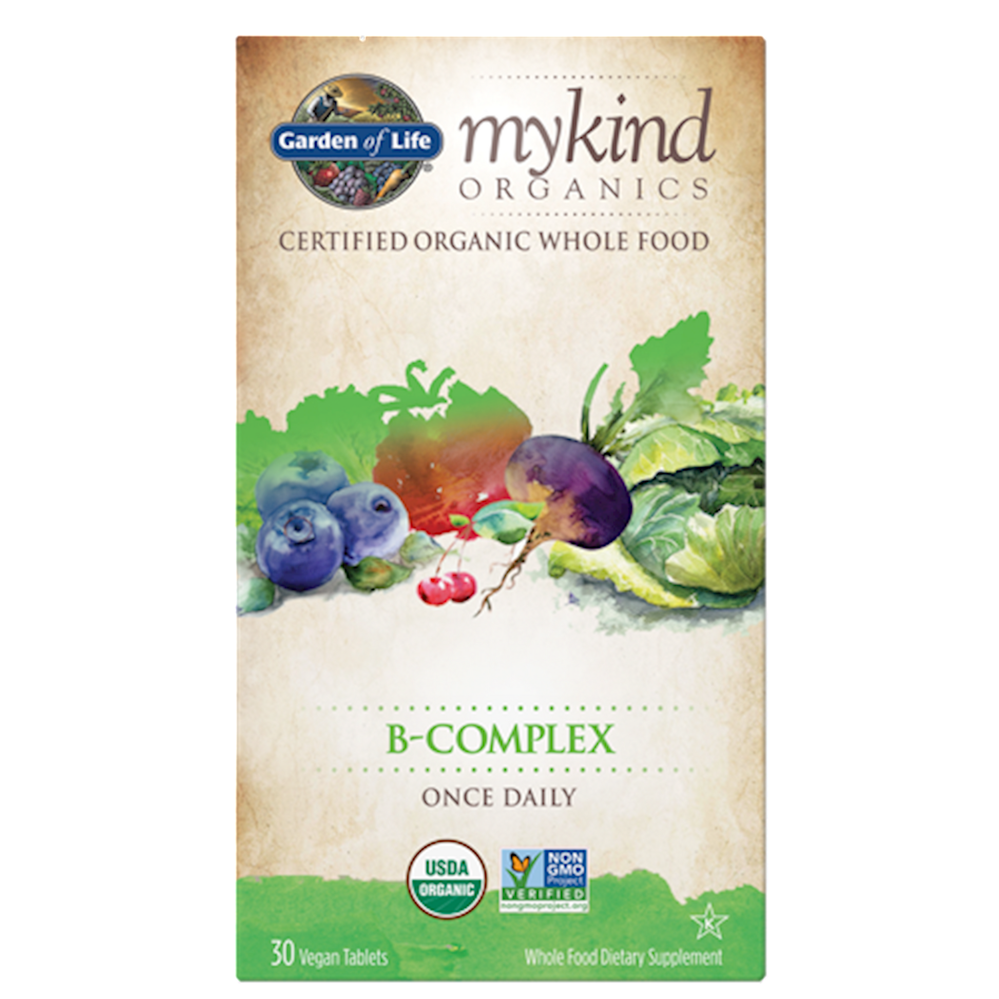 Once daily whole food B-Complex formula that is Certified Organic and Non-GMO Verified from real, nutritious foods. mykind Organics B-Complex Benefits: Supports Energy, Healthy Metabolism & Stress Response, while Supporting Blood and Heart Health* Formulated With 8 B Vitamins Made from over 25 powdered fruits, vegetables and herbs