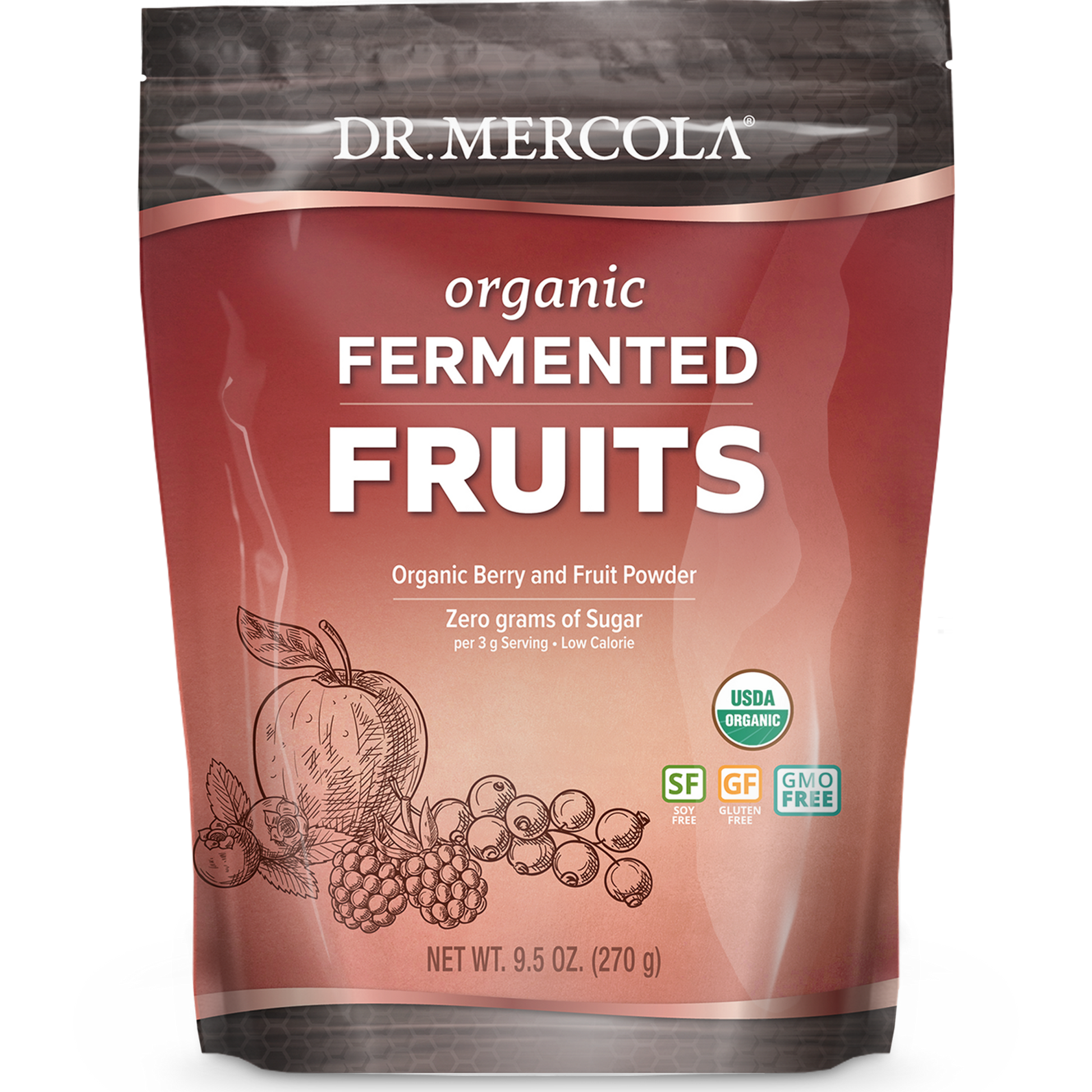 Dr. Mercola's Organic Fermented Fruits includes an array of whole fermented fruit powders and pomegranate juice packed with antioxidants. The fermentation process not only reduces the naturally occurring sugars, resulting in 0 g of sugar per serving; it also helps to make the nutrients easier to digest, allowing for improved absorption of all of those beneficial polyphenols. Now you can obtain the beneficial nutrients in fruit without ingesting the high concentrations of sugar typically present.