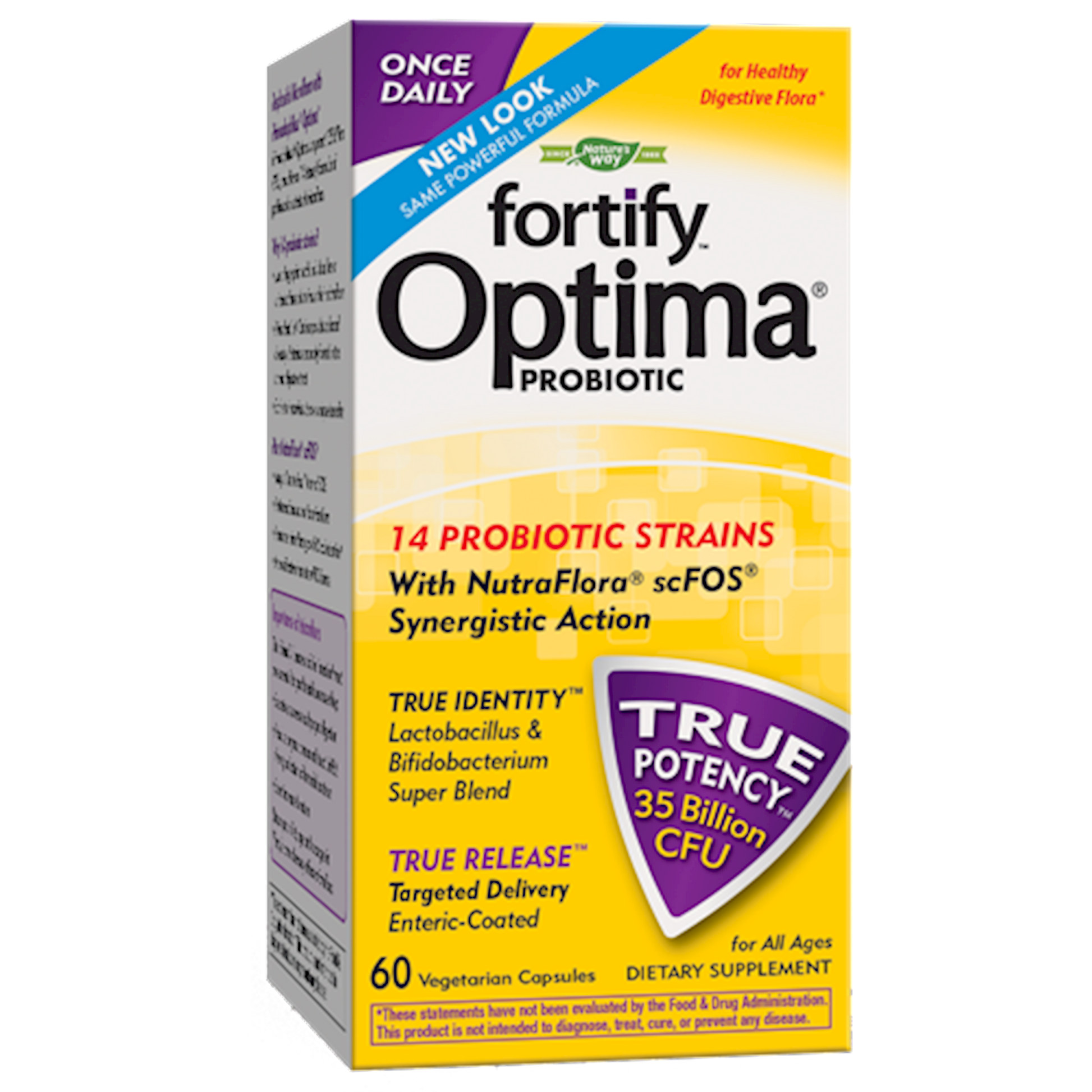 Probiotic capsules for all ages with 35 billion CFUs & 14 strains of bacteria. Replenish Microflora with Fortify Optima* Potent 35 billion CFUs and diverse 14 strains of probiotics for intestinal microflora.* 35 billion CFUs per capsule of 14 synergistic strains With NutraFlora scFOS For all ages Suitable for vegetarians Exclusively backed by True Guarantee True Potency ensures 35 billion CFUs per capsule for the entire shelf life True Identity ensures only the strains listed on the label are found in the product True Release enteric-coating ensures stomach acid survival and intestinal delivery