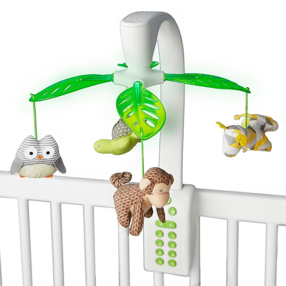 Skip Hop's baby mobile has a soft color palette and sleek look to coordinate with the modern nursery. While stars are projected on the ceiling, it lulls little one to sleep with gently blinking leaves along with eight total lullabies and nature sounds. Just use the light and sound combination that's right for your baby. A remote control allows you to restart the mobile after 20 minutes with the touch of a button, even from outside the nursery. Music to our ears!