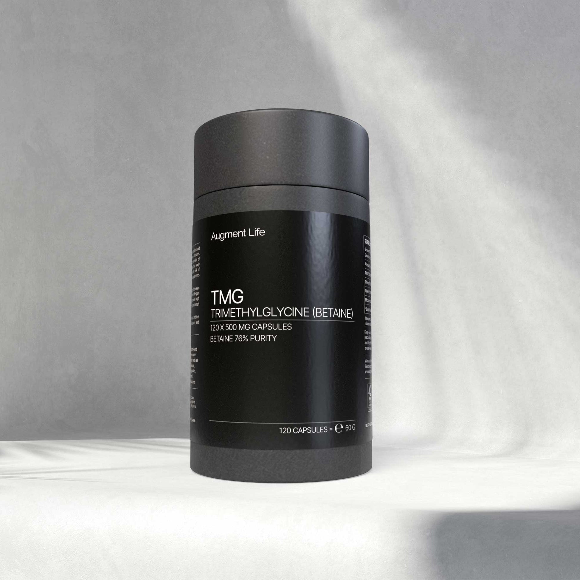 TMG stands for trimethylglycine or betaine, which is an amino acid naturally produced by our bodies from choline in small amounts. TMG's role is to take part in DNA methylation and conversion of homocysteine to methionine, which is important to keep the body healthy. High levels of homocysteine provenly increase the risk of heart disease1, and taking higher doses of TMG through supplements might prevent it. Furthermore, TMG might help fight depression2. A synergy between taking NMN and TMG supplements for a longer and healthier lifespan has recently been proposed. The breakdown of NMN requires high levels of methionine, and TMG supplements might help replenish them3. TMG is safe when taken in doses of up to 15 grams per day, and the most common side effects are nausea, gastrointestinal issues, and increased levels of LDL cholesterol in the body4.