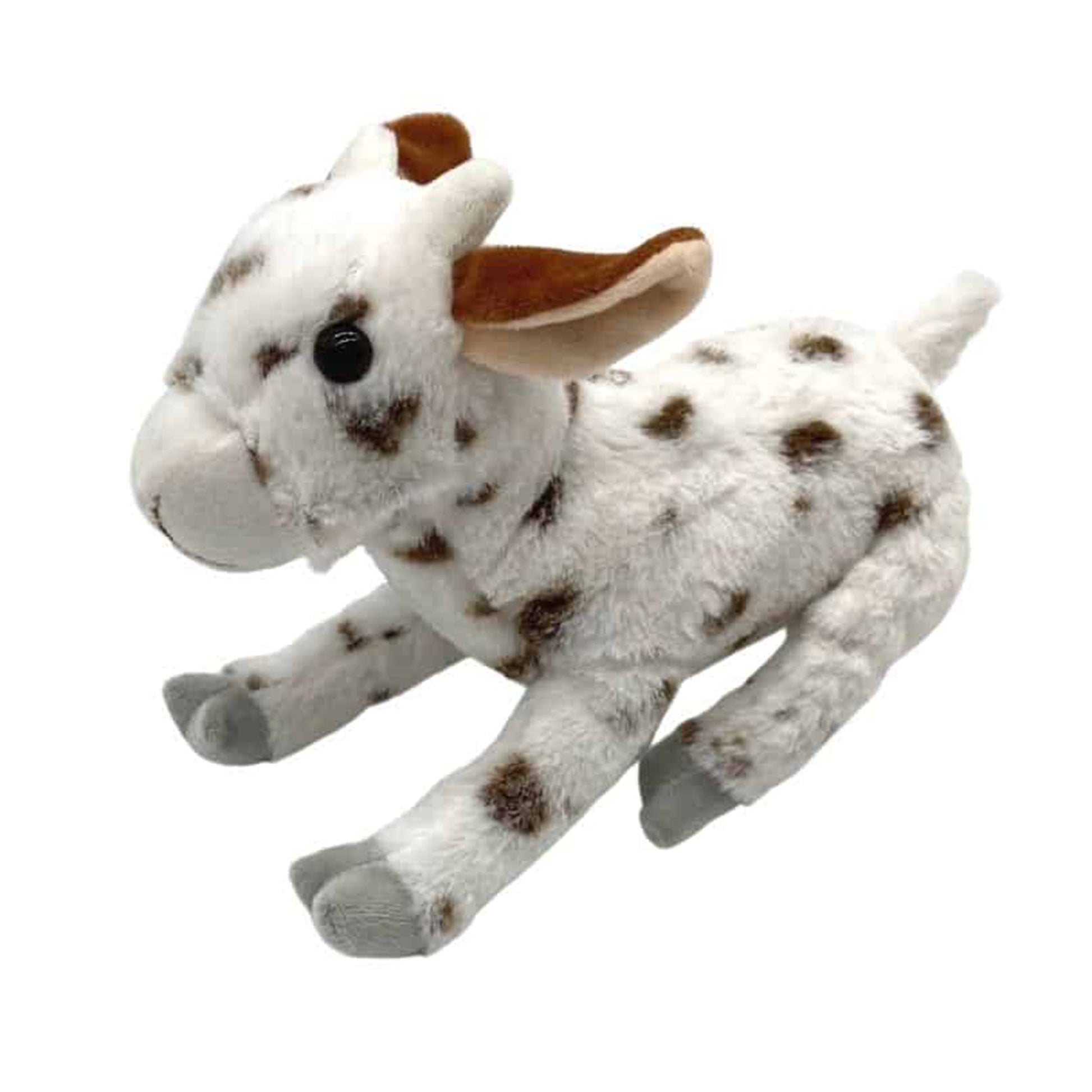 Meet Clyde the goat he is white with brown spots! Soft and safe for the kiddo's!